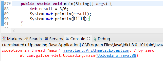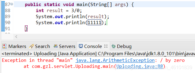 由于0不能当除数,所以在执行到这一行代码直接报错,然后程序直接就被中断了,以至于后面的代码也并未执行。Java中有很多异常,如空指针异常、数组下标越界异常、文件找不到异常等等。在java中,把上述异常都称为异常对象。当程序执行到某一个方法处产生异常时,Java虚拟机就会产生与已产生的异常相匹配的异常对象。如果不对异常处理,就会出现上述情况。