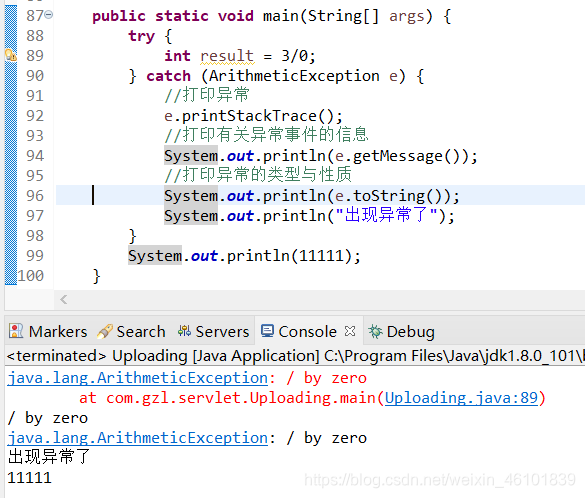 4、异常既可以使用try-catch处理,也可以使用throws关键字处理,根据实际情况来判断使用哪种方式,两种关键的点就是,使用try-catch发生错误之后可以不影响线程继续执行下面代码,而throws代码抛出异常,也就是不管他,发生异常线程直接终止。