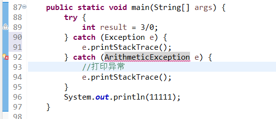 由于ArithmeticException是Exception的子类,但是却放在了他的下面,这就会直接报错。