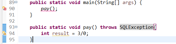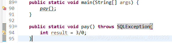 上图我故意在方法上抛出了一个SQLException异常,所以只要用这个方法,那就得处理异常,因为他不是运行异常,而是编译异常,至于是抛异常处理,还是try-catch处理,这个可以自行决定。