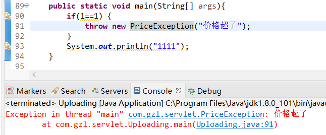 throw关键字虽然可以用于抛出Exception类中的子类异常,但更重要的用途是抛出自定义异常。语法如下: