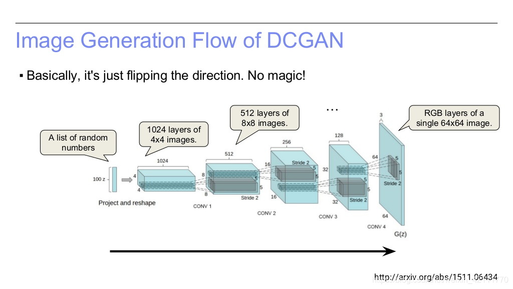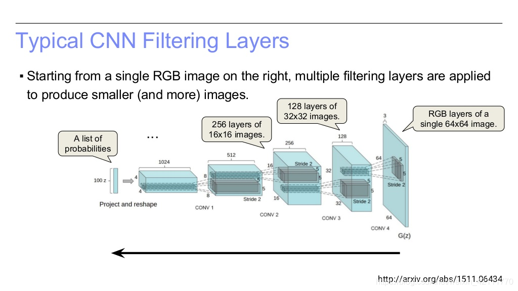如图4所示,DCGAN的输入是个100维的均匀分布的向量,然后经过一系列的反卷积操作输出64*64大小的RGB图像。如下面三张PPT所示,DCGAN的操作恰恰与传统的CNN的计算方向相反,CNN中使用卷积操作,则DCGAN中使用反卷积(deconvolutional/transposed-convolution)。