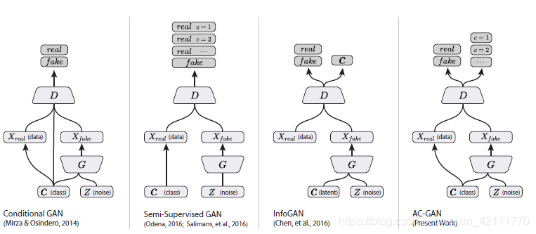 如上面介绍的CGAN,使用side information扩充原GAN,为了能够生成class conditional samples, 给生成器和判别器提供类别标签(class labels);如上面介绍的infoGAN,调整判别器,使其包含一个辅助解码网络(auxiliary decoder network),网络的输出为生成样本隐含量的一个子集(semi-Supervised GAN中辅助网络输出的是训练数据的类别标签)。结合这两种策略利用side information,因此ACGAN应用而生,ACGAN模型属于class contional, 但是是使用一个辅助的解码器来重建类别标签。盗一个图使得上述语言描述图示化。