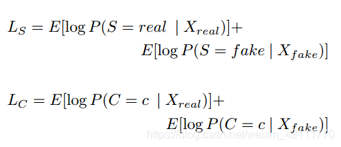 ,判别器D分别对图像的真假和类别标签给出判别概率,所以目标方程包含两部分,如下所示: