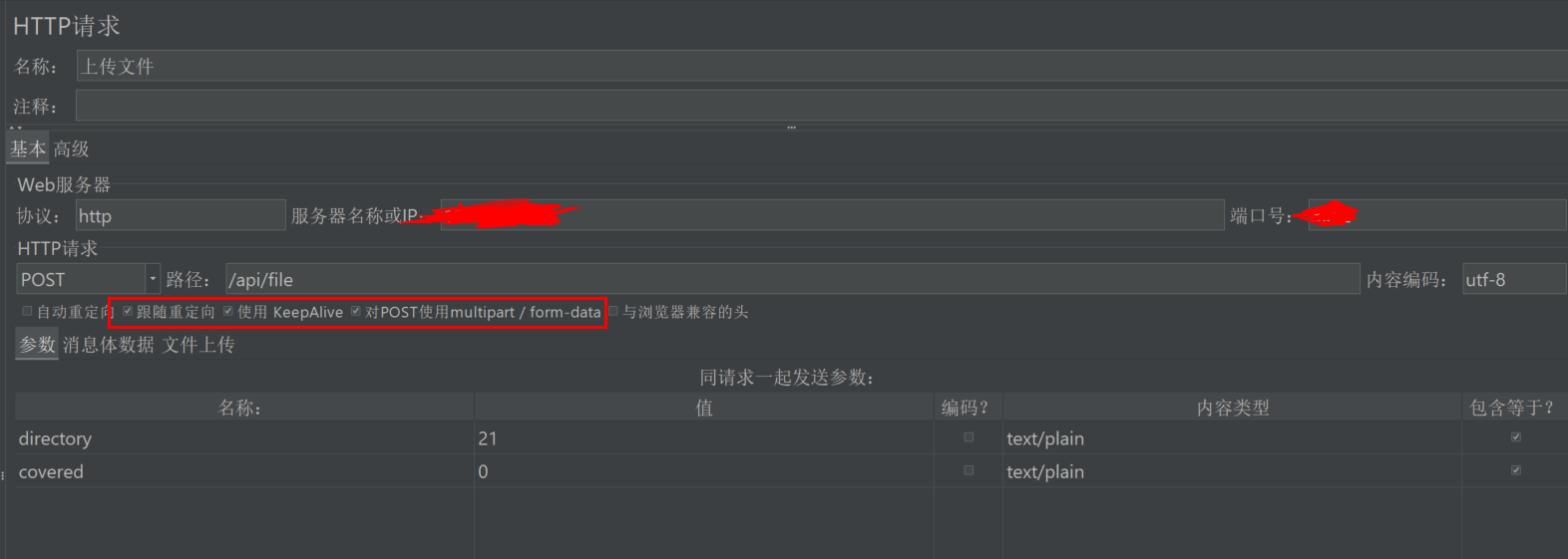 基本信息里面填入URL相关信息即可,普通参数直接在当前输入;注意勾选form-data复选框;