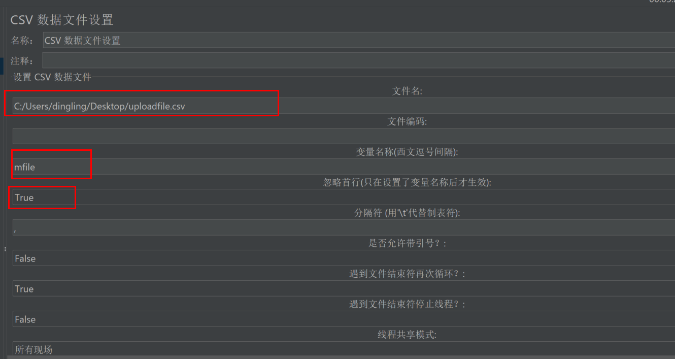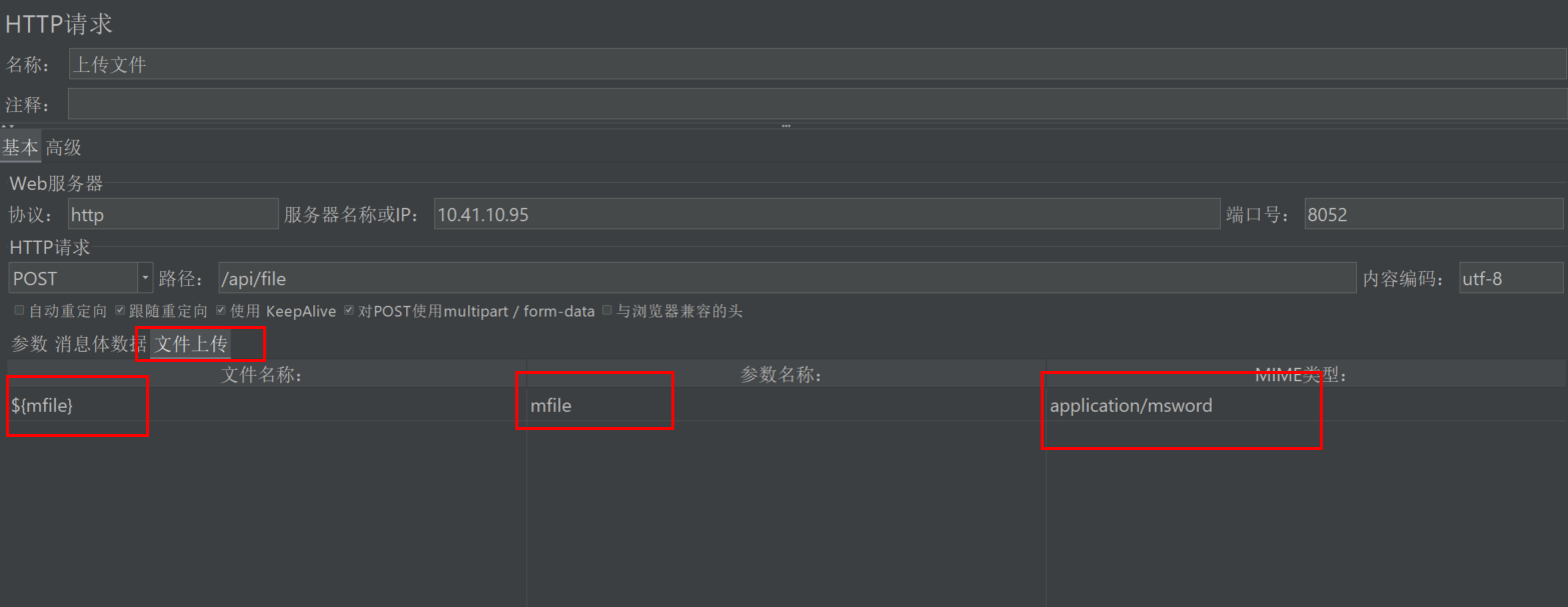 文件上传 的文件名采用的是动态变量,我这里定义为mfile,参数里面要写成 ${mfile}