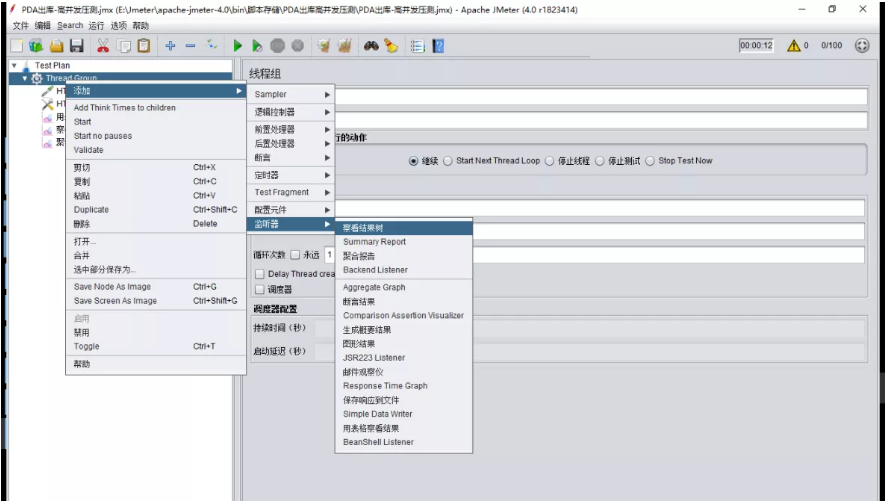 5、添加用表格查看结果,查看结果树,聚合报告:Thread Group上右键-添加监听器,一个一个加上即可: