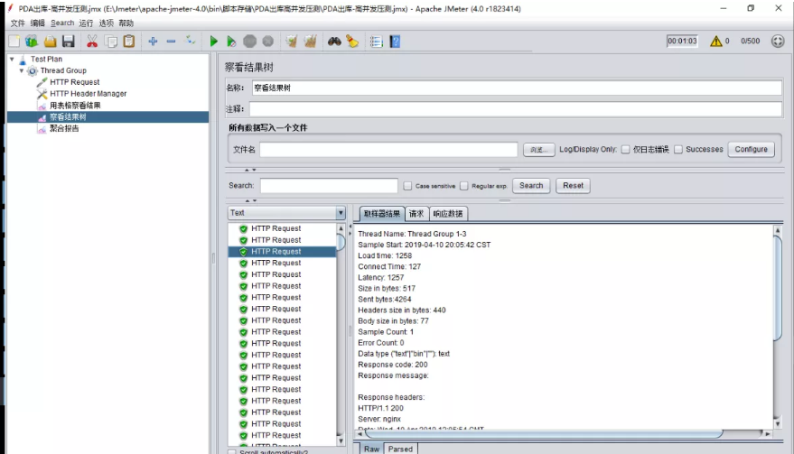 如果是红色的小盾牌,说明请求失败,这时候可以通过右边的取样器结果和响应数据来查看结果。