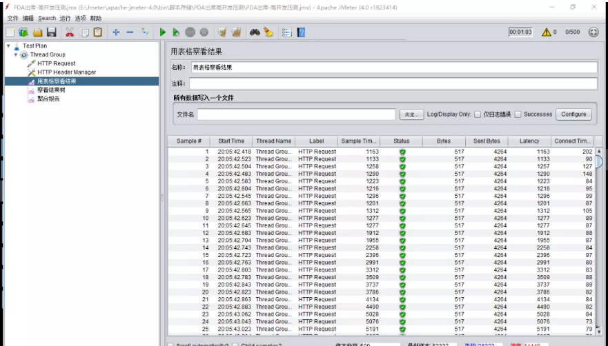 在“用表格察看结果”中可以非常直观地看到:线程组名称,每个线程响应时间,返回结果是否成功,字节数等信息,对整体结果有一个大体的掌握。