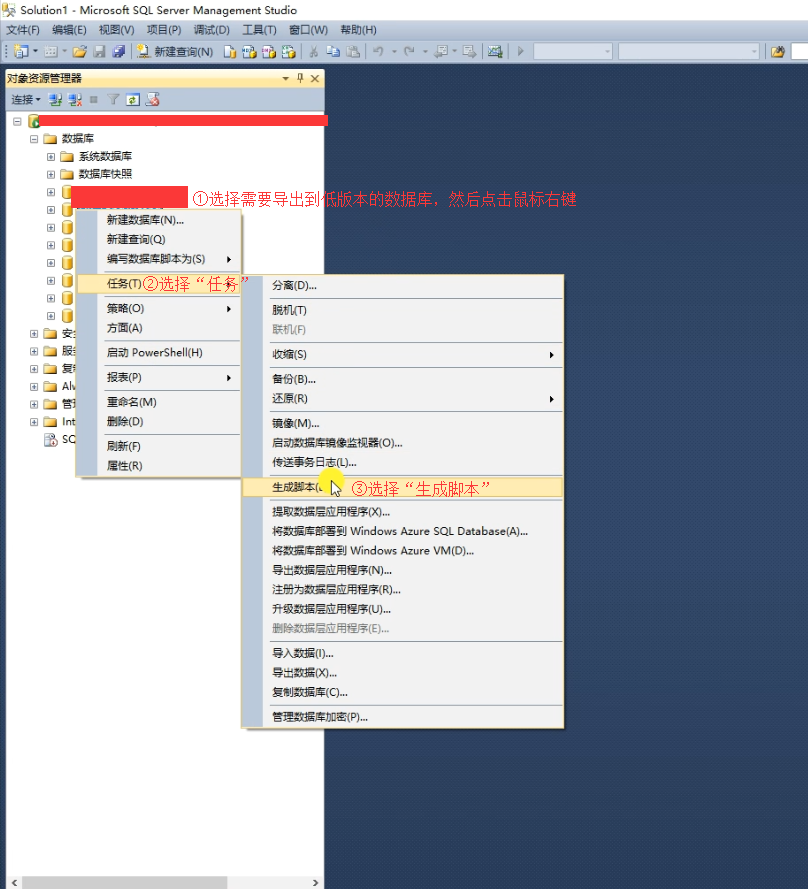 Sqlserver高版本数据库还原到低版本数据库的操作步骤如下