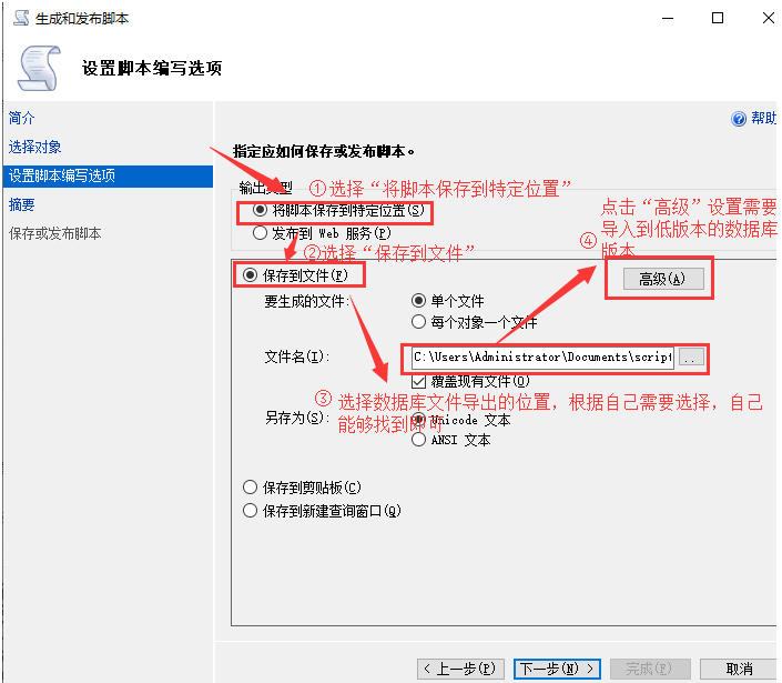 ④选择数据库文件导出的位置,然后点击“高级”按钮设置当前数据库需要导出到的低数据库的版本