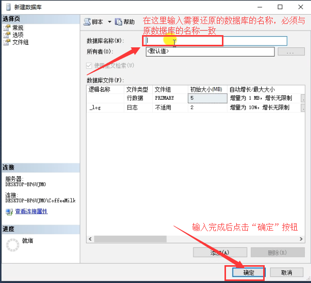 ②在新建数据库的弹窗中输入当前需要还原的数据库名称,注意:这里输入的数据库名称必须与导出的数据库名称一致