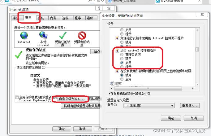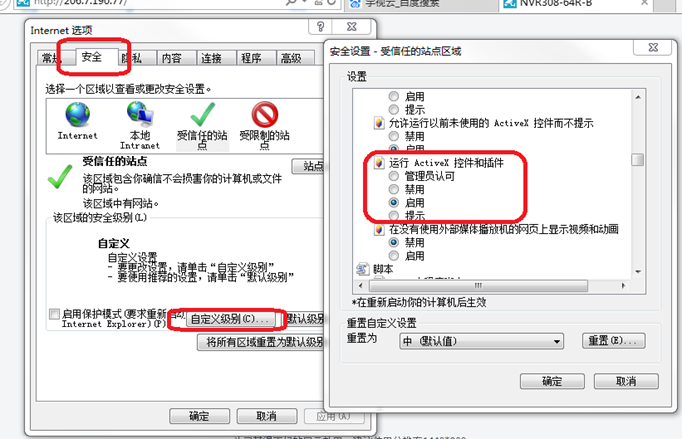 b . Internet选项——安全——自定义级别,启用运行ActiveX控件和插件。