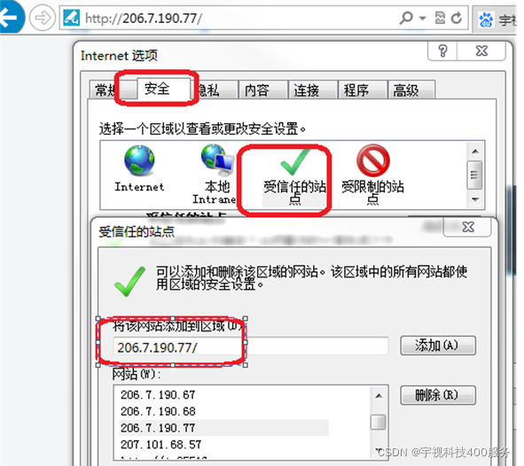 a . Internet选项——安全——受信任站点,将对应的IP地址添加到受信人的站点。