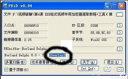 1.本次经验主要针对飓风加密、三分屏加密的视频,具体图标如下。首先打开PEiD 0.94优化版工具,选择加密视频,拖进PEiD 0.94面板中,观察视频是否加壳,主要是查看[Overlay],如果出现[Overlay],说明未加壳,就比较容易处理。