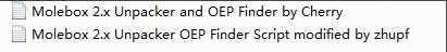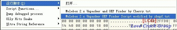 4.这时候光标会显示在有浅蓝色背景的一行代码上,这些不用管,单击右键->运行脚本->打开“Molebox 2.x Unpacker OEP Finder Script modified by zhupf.txt”和“Molebox 2.x Unpacker and OEP Finder by Cherry”,可以先后运行这两个文档。