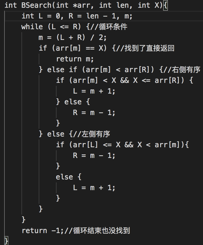 int BSearch(int *arr, int len, int X){int L = 0, R = len - 1, m;while (L <= R) {//循环条件m = (L + R) / 2;if (arr[m] == X) {//找到了直接返回return m;} else if (arr[m] < arr[R]) {//右侧有序if (arr[m] < X && X <= arr[R]) {L = m + 1;} else {R = m - 1;}} else {//左侧有序if (arr[L] <= X && X < arr[m]){R = m - 1;}else {L = m + 1;} }}return -1;//循环结束也没找到