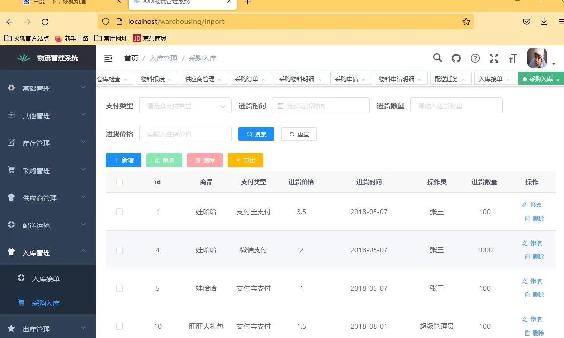 2.采购管理:系统采购管理,是本平台的一个初始化工作的登记,通过系统用户的用料商品的采购,进行登记管理,能够让平台最初的信息登记做到信息化的统计,方便用户在后期对采购商品的查看管理。
