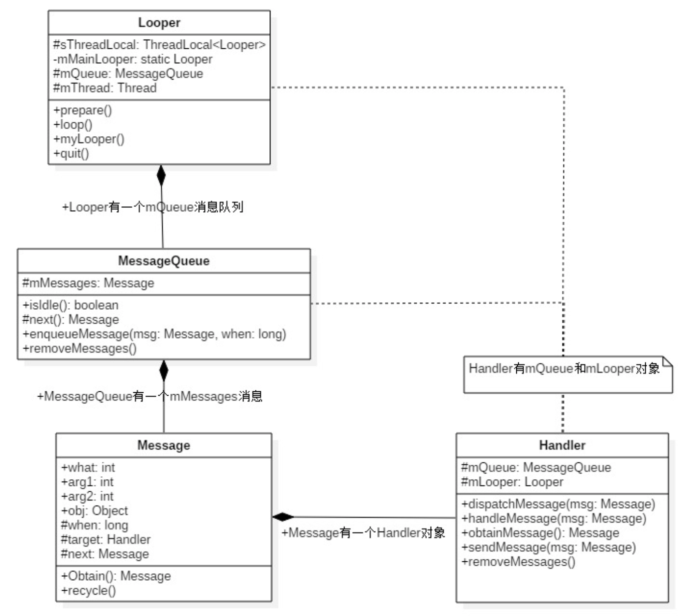 Message: 消息分为硬件产生的消息(如按钮、触摸)和软件生成的消息,代表一个行为(what)或者一串动作(Runnable);MessageQueue: 消息队列,存放消息。单链表维护,在插入和删除上有优势,在next方法中会无限循环,判断是否有消息,如果有就返回这条消息并移除(读取会自动删除);Handler: 主要功能是向消息队列中发送各种消息事件(Handler.sendMessage)和处理相应消息事件(Handler.handleMessage);Looper:Looper创建的时候会创建一个MessageQueue,调用Looper.loop()消息循环开始,这是一个死循环,会不断调用MessageQueue.next方法,有消息时就处理,没有就阻塞在messageQueue.next方法中。当Looper.quit方法被调用的时候会调用MessageQueue.quit方法,此时MessageQueue.next会返回null,然后Looper.loop()方法也会退出;
