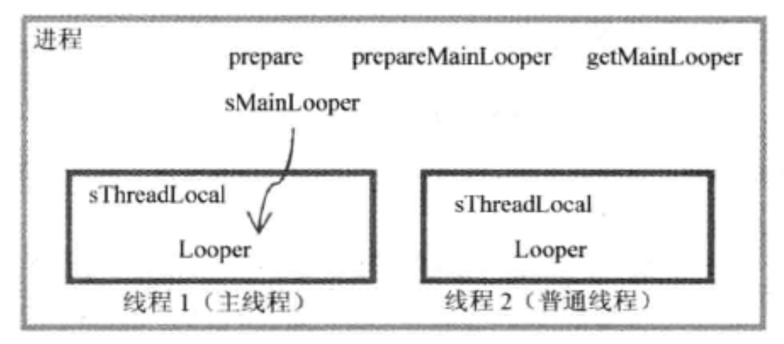 上图描述的是一个进程和它内部两个线程的Looper情况,其中线程1是主线程,线程2是普通线程。方框表示它们能访问的范围,如线程1就不能直接访问线程2中的Looper对象,但二者都可以接触到进程中的各元素。