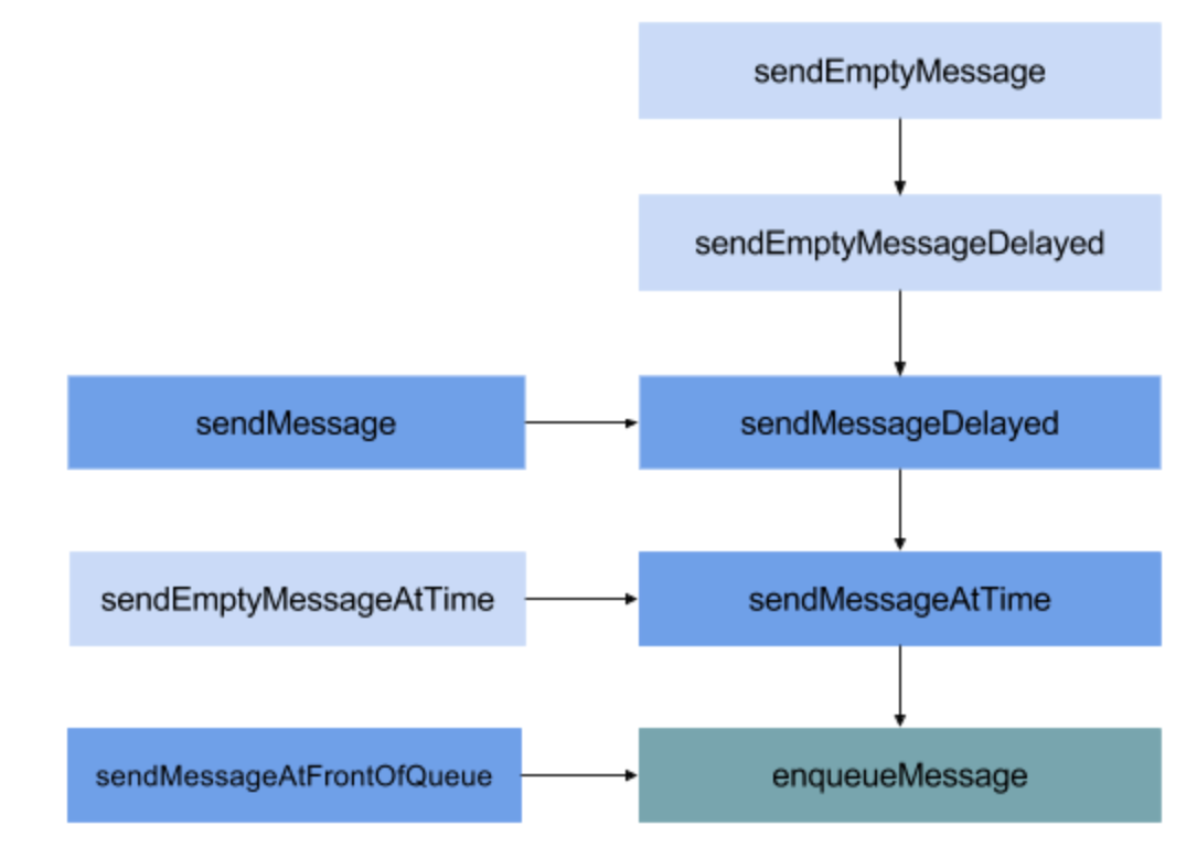 public class Handler {public final boolean post(@NonNull Runnable r) {return sendMessageDelayed(getPostMessage(r), 0);}private static Message getPostMessage(Runnable r) {Message m = Message.obtain();m.callback = r;return m;}public final boolean sendMessageDelayed(@NonNull Message msg, long delayMillis) {if (delayMillis < 0) {delayMillis = 0;}return sendMessageAtTime(msg, SystemClock.uptimeMillis() + delayMillis);}public boolean sendMessageAtTime(@NonNull Message msg, long uptimeMillis) {MessageQueue queue = mQueue;if (queue == null) {RuntimeException e = new RuntimeException(this + " sendMessageAtTime() called with no mQueue");Log.w("Looper", e.getMessage(), e);return false;}return enqueueMessage(queue, msg, uptimeMillis);}public void dispatchMessage(@NonNull Message msg) {if (msg.callback != null) {handleCallback(msg);} else {if (mCallback != null) {if (mCallback.handleMessage(msg)) {return;}}handleMessage(msg);}}private static void handleCallback(Message message) {message.callback.run();}}