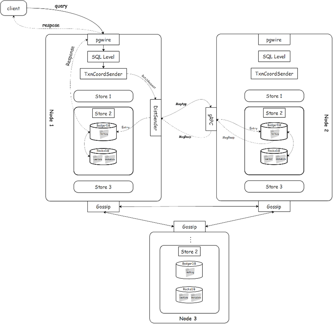 部署时 BadgerDB 需要与 RocksDB 并列进行部署,即一个 Node 上部署相等数量的 RocksDB 实例和 BadgerDB 实例(由目前云溪数据库中副本平衡策略所决定)。查询请求的大致处理流程是先将 Raft Log 写入 BadgerDB,等待集群过半数节点达成共识后,再将 Raft Log 应用到状态机,即将 Raft Log 转化成用户数据写入到 RocksDB,用户写入成功后再将 BadgerDB 中已应用的 Raft Log 删除,同时将状态数据更新到 RocksDB 中。