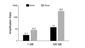 下面先分析一下 LSM-Tree 写、读放大。写放大主要是因为各个层级之间的 Compaction,当两个层级之间做 Compaction 时,都需要将多个 SSTable 读到内存排序(读放大),然后写到磁盘。读放大主要是在 LSM-Tree 中查找一个 key 时,一般查询流程是 MemTable、Immutable MemTable 以及 SSTable。如果该 key 不存在,虽然 MemTable 和 Immutable MemTable 是内存操作很快,但是在 Level 0 层的 SSTable 中 Key 是全局无序的,可能还有重叠,需要全扫,更高层级的 SSTable 中也需要二分查找,虽然有 bloom filter 但是依旧影响查找的效率。图 1 中展示了 LevelDB 中写、读方法的测试,数据集大小分为 1G 和 100GB,其中 Key 大小为 16B,Value 大小为 1KB。