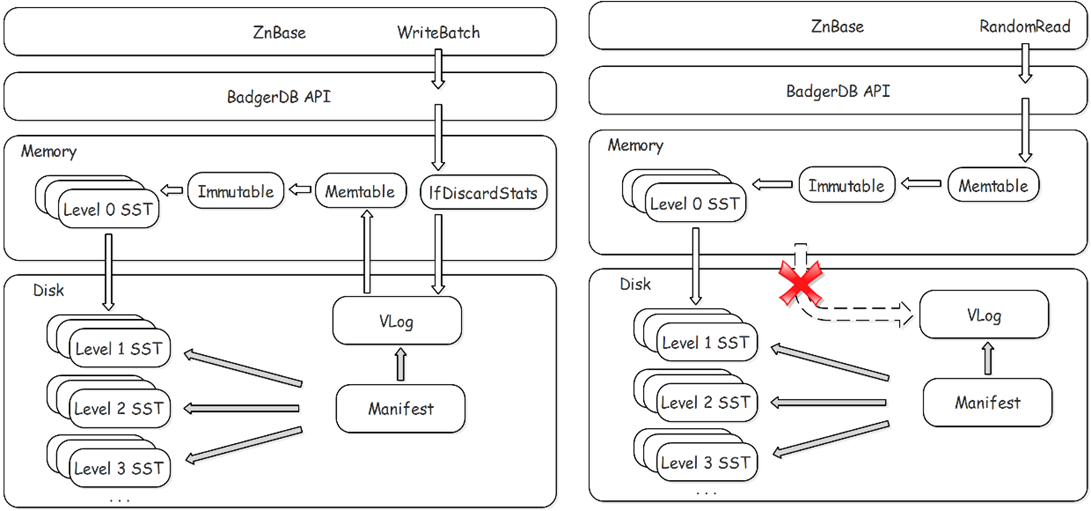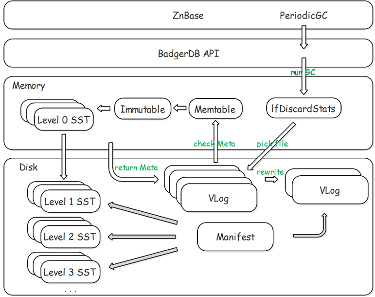 BadgerDB 是基于 Wisckey 论文实现的,整体架构类似 LevelDB,具体如图 6 所示,区别就在于去掉了 LSM-Tree 里面的 WAL,用 vLog 代替。在实现上,去掉了 current 文件。