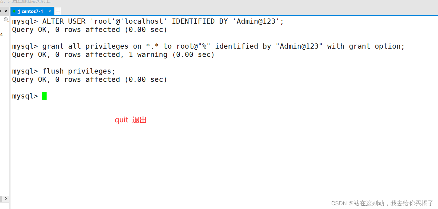 ALTER USER 'root'@'localhost' IDENTIFIED BY 'Admin@123'; #密码设置要求有 大小写字母、数字和符号 组合grant all privileges on *.* to root@"%" identified by "Admin@123" with grant option; #允许所有通过数据库密码访问的主机