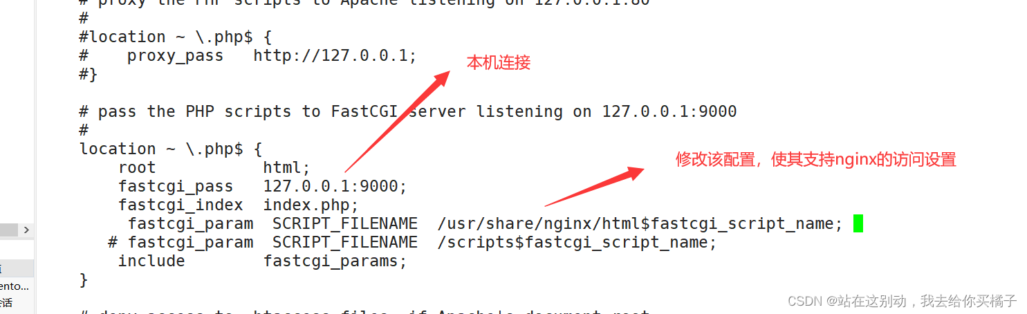 ......location ~ \.php$ {root html;fastcgi_pass 127.0.0.1:9000;fastcgi_index index.php;fastcgi_param SCRIPT_FILENAME /usr/share/nginx/html$fastcgi_script_name; #将 /scripts 修改为nginx的工作目录include fastcgi_params;}