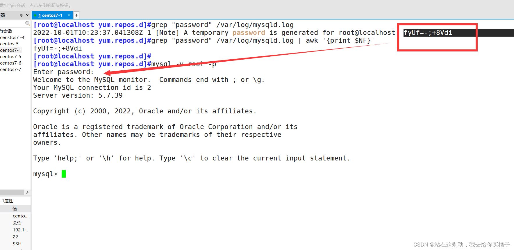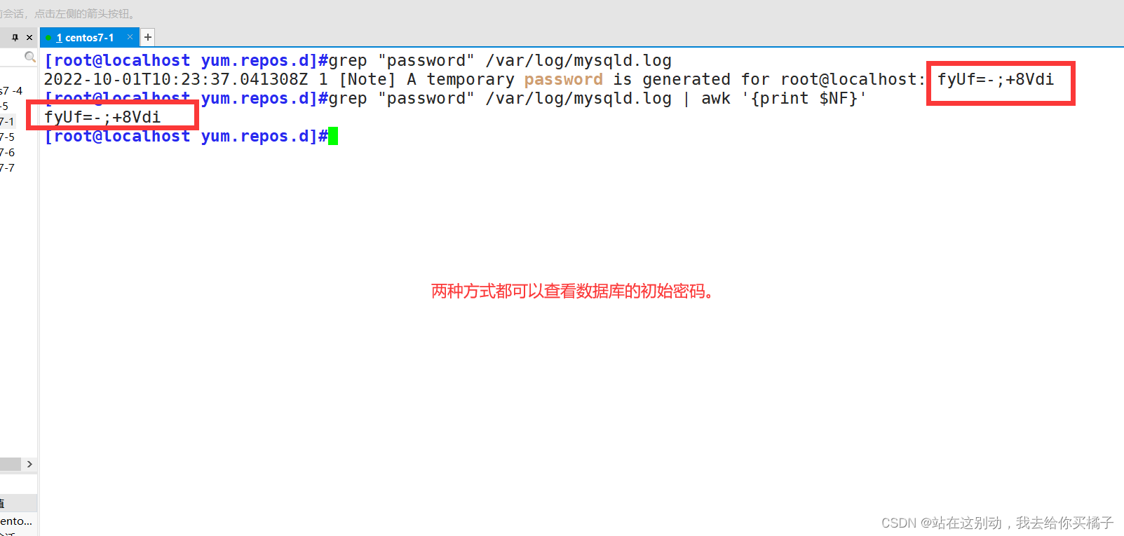 grep "password" /var/log/mysqld.log #在日志文件中找出root用户的初始密码grep "password" /var/log/mysqld.log | awk '{print $NF}'