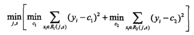 上式中的中括号里面的表示,在父节点划分标准为第j个变量,划分点为s的情况下,取两个子集小误差,里面是两个最小值的和,分别表示取一个合适的c1和c2,使子集的平方和最小,而这个c1和c2的取值分别是子集yi的平均数。而外层的循环,就是取合适的变量j,以及其合适的划分标准s使划分后的子集误差最小。