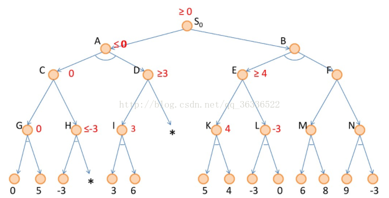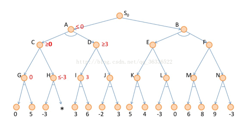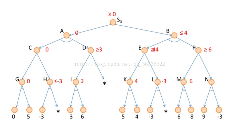 作为MAX节点,假定它的MIN节点有N个,那么当它的第一个MIN节点的评估值为α时,则对于其它节点,如果有高于α的节点,就取那最高的节点值作为MAX节点的值;否则,该点的评估值为α。