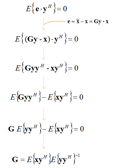 这就是为什么我们可以利用接收信号 "y "和误差 "e "之间的相关性为零的标准来推导出MMSE最优矩阵G的原因。