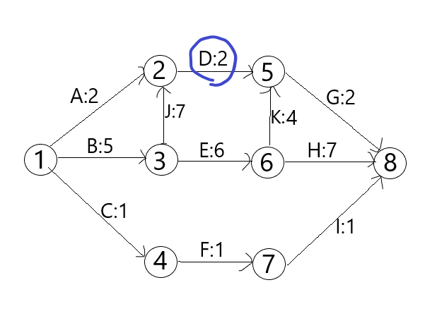 答案:D的总时差=2,自由时差=1.如下图,总时差是蓝色-红色;自由时差是两个绿色之差。