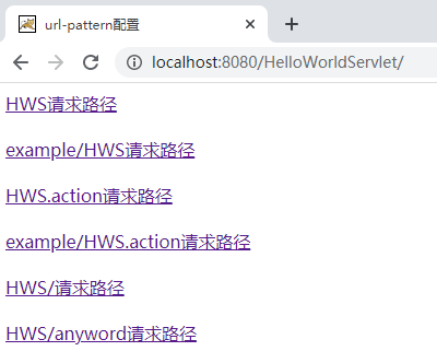 <html><head><meta charset="UTF-8" /><title>url-pattern配置</title></head><body><!-- HelloWorldServlet之前不能有/ --><a href="HWS">HWS请求路径</a><br /><br /><a href="example/HWS">example/HWS请求路径</a><br /><br /><a href="HWS.action">HWS.action请求路径</a><br /><br /><a href="example/HWS.action">example/HWS.action请求路径</a><br /><br /><a href="HWS/">HWS/请求路径</a><br /><br /><a href="HWS/anyword">HWS/anyword请求路径</a></body>