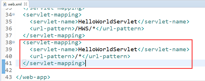 <web-app xmlns:xsi="http://www.w3.org/2001/XMLSchema-instance" xmlns="http://java.sun.com/xml/ns/javaee" xsi:schemaLocation="http://java.sun.com/xml/ns/javaee http://java.sun.com/xml/ns/javaee/web-app_2_5.xsd" id="WebApp_ID" version="2.5"><display-name>HelloWorldServlet</display-name><welcome-file-list><welcome-file>index.html</welcome-file><welcome-file>index.htm</welcome-file><welcome-file>index.jsp</welcome-file><welcome-file>default.html</welcome-file><welcome-file>default.htm</welcome-file><welcome-file>default.jsp</welcome-file></welcome-file-list><servlet><servlet-name>HelloWorldServlet</servlet-name><servlet-class>com.lywgames.myservlet.HelloWorldServlet</servlet-class></servlet><!-- 一个servlet配置了多个映射 --><servlet-mapping><servlet-name>HelloWorldServlet</servlet-name><url-pattern>/HWS</url-pattern></servlet-mapping><servlet-mapping><servlet-name>HelloWorldServlet</servlet-name><url-pattern>/example/HWS</url-pattern></servlet-mapping><servlet-mapping><servlet-name>HelloWorldServlet</servlet-name><url-pattern>/HWS.action</url-pattern></servlet-mapping><servlet-mapping><servlet-name>HelloWorldServlet</servlet-name><url-pattern>/example/HWS.action</url-pattern></servlet-mapping><servlet-mapping><servlet-name>HelloWorldServlet</servlet-name><url-pattern>/HWS/*</url-pattern></servlet-mapping>