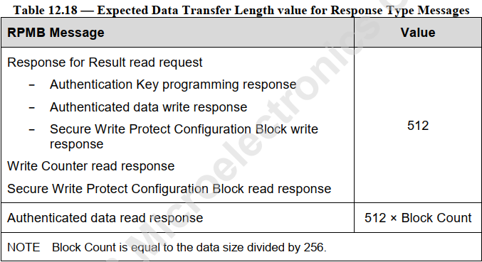 - 当设备接收到RPMB消息数据帧时,它首先检查写计数是否无效。如果写计数无效,则设备将结果设置为“Write failure, write counter expired” (0085h)。安全写保护配置块不会被更新。