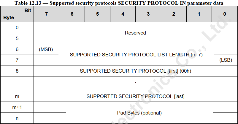 根据[SPC],如果device支持SECURITY PROTOCOL IN cmd,SECURITY PROTOCOL field value of 00h应该被支持,被用来从逻辑单元传输安全协议相关信息;
