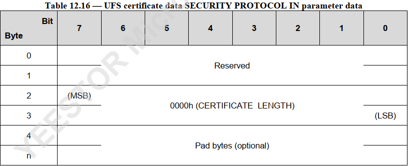 SECURITY PROTOCOL IN和SECURITY PROTOCOL OUT包含SECURITY PROTOCOL field。T10为JEDEC UFS应用分配了一个特殊的安全协议ID。SECURITY PROTOCOL IN/OUT cmd应把此ID当成唯一有效的Security Protocol ID。