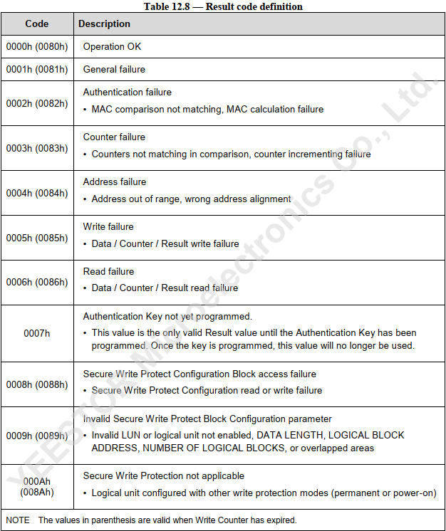 - 如果写入过程中发生其他错误,则返回的结果为“Secure Write Protect Configuration Block access failure”(0008h)。安全写保护配置块不会被更新。