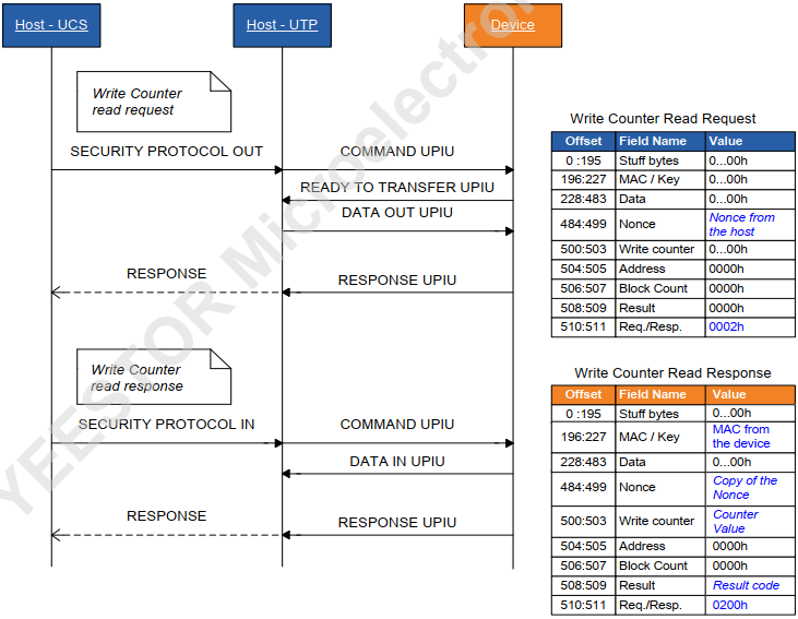 - 如果请求中的MAC和计算出的MAC相等,则设备会将请求中的写计数与存储在设备中的写计数进行比较。如果两个值不同,则设备将结果设置为“Counter failure”(0003h)。安全写保护配置块不会被更新。