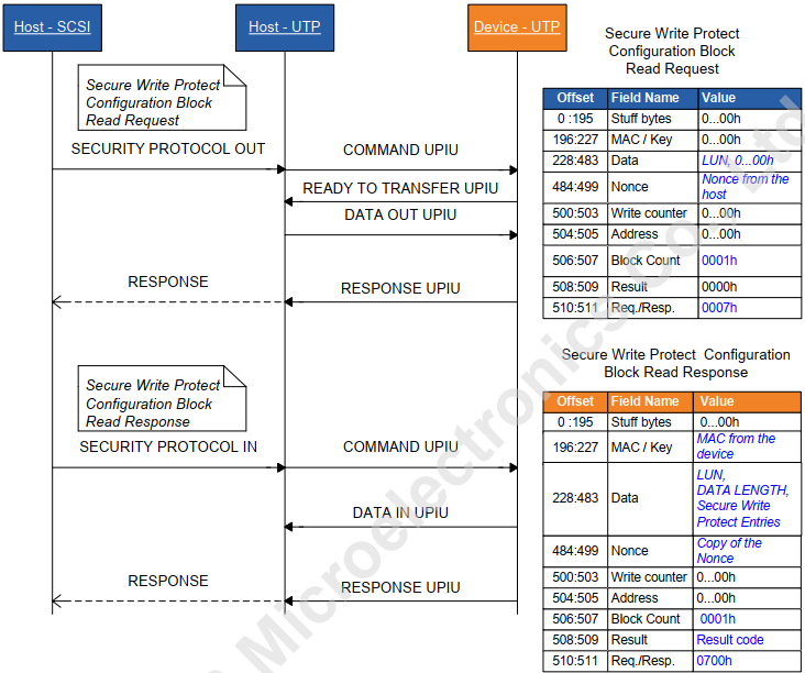 - SECURITY PROTOCOL OUT cmd传输一个RPMB消息数据帧,其中包含数据字段中的安全写保护配置块。LUN字段(数据帧的byte228)指示逻辑单元特定的安全写保护配置块。