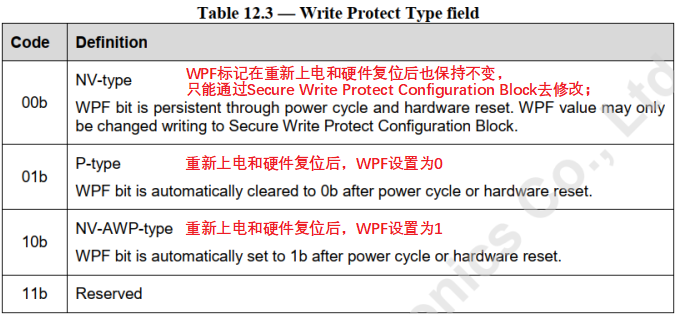 安全写保护配置块可能包含条目0,条目0/1,条目0/1/2,或条目0/1/2/3。如果安全写保护配置块不包含任一条目,即DATA LENGTH=00h,在特定逻辑单元的所有条目将被移除;Table 12.2 定义了Secure Write Protect Entry的结构。