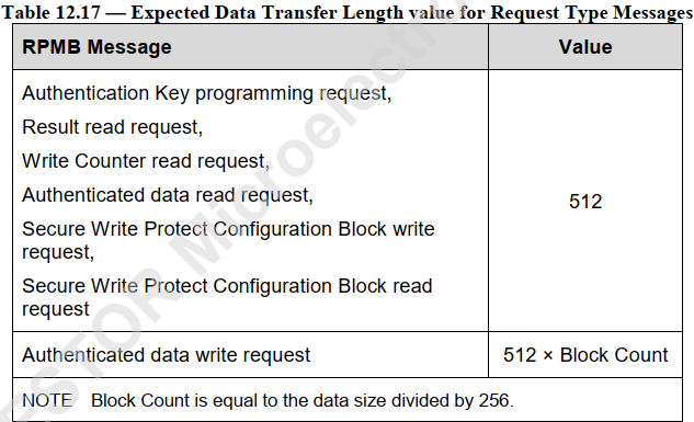 - 对于一个authenticated data write request,请求信息中包含了要写到RPMB的数据,单个authenticated data write request传输的最大的数据=bRPMB_ReadWriteSize × 256 bytes,如果所需的数据大小超过此值,则应执行多个authenticated data write operations;
