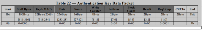 用作MAC计算输入的信息是数据帧中字段的连接,其中不包括 stuff bytes, theMAC itself, start bit, CRC16, and end bit。 也就是说, MAC是按照数据帧中bytes[283:0]中的顺序来计算的。在请求或者响应中,如果有很多个数据包被发送,那么这些数据包的bytes [283:0]按照发送的循序拼接一起,然后作为MAC计算的输入信息。MAC只会放在最后一个数据包中。