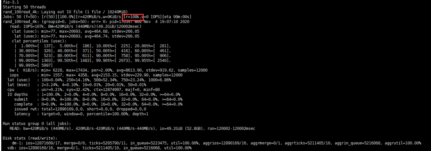 # fio -filename=/opt/100_rand_read -direct=1 -iodepth 1 -thread -rw=randread -ioengine=psync -bs=4k -size=10G -numjobs=50 -runtime=120 -group_reporting -name=rand_100read_4k