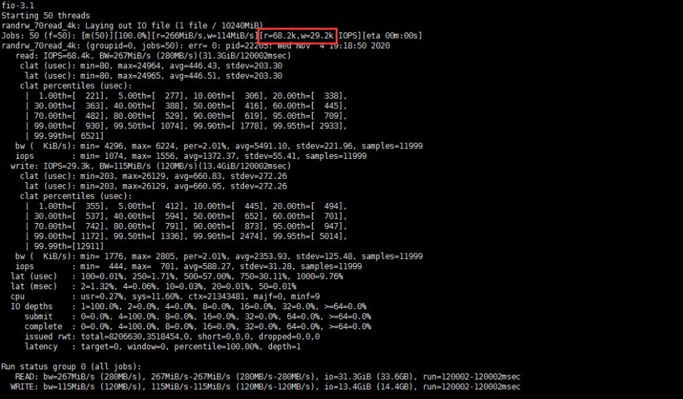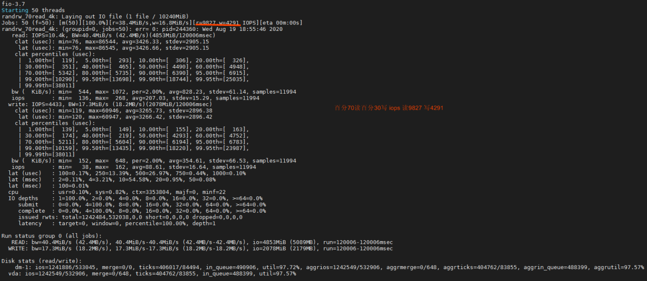 # fio -filename=/opt/70_rand_read_30_rand_write -direct=1 -iodepth 1 -thread -rw=randrw -rwmixread=70 -ioengine=psync -bs=4k -size=10G -numjobs=50 -runtime=120 -group_reporting -name=randrw_70read_4k