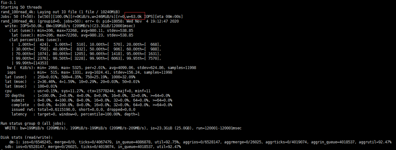 # fio -filename=/opt/100_rand_write -direct=1 -iodepth 1 -thread -rw=randwrite -ioengine=psync -bs=4k -size=10G -numjobs=50 -runtime=120 -group_reporting -name=rand_100read_4k