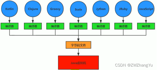 每个语言都需要转换成字节码文件,最后转换的字节码文件都能通过Java虚拟机进行运行和处理。